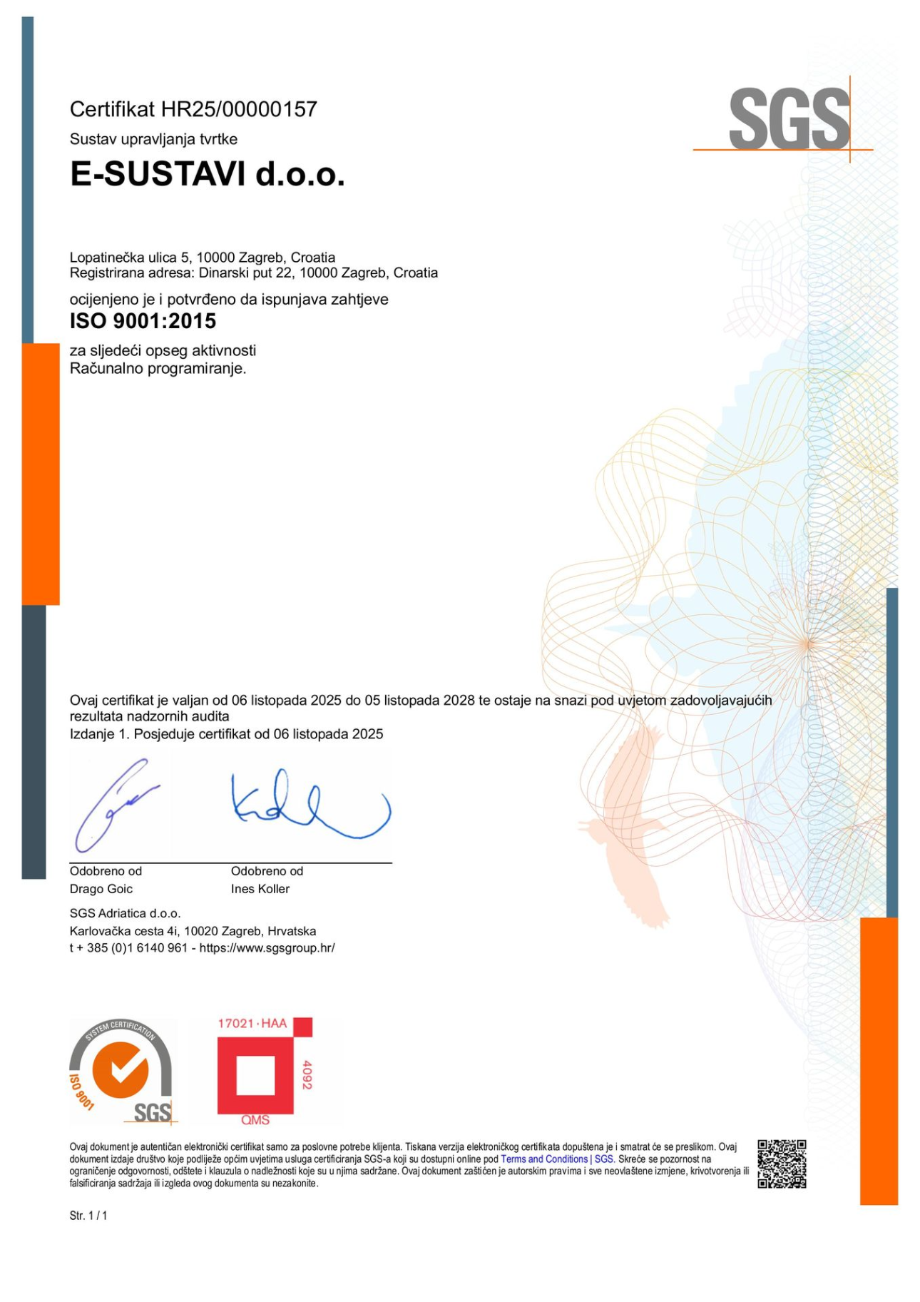 ISO 9001 je međunarodni standard koji definira zahtjeve za sustav upravljanja kvalitetom unutar organizacije.Posjedovanje ovog certifikata potvrđuje da je organizacija uspješno implementirala učinkovite procese upravljanja kvalitetom, s ciljem povećanja zadovoljstva klijenata i postizanja stalnog poboljšanja poslovanja.