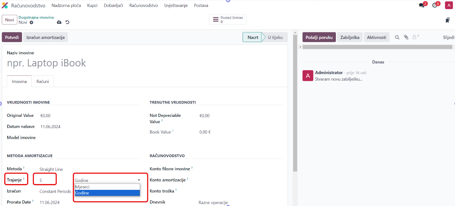 Opcija "kontni plan" omogućuje vam unos računa koji će se koristiti za smanjenje vrijednosti imovine tijekom unosa amortizacije.