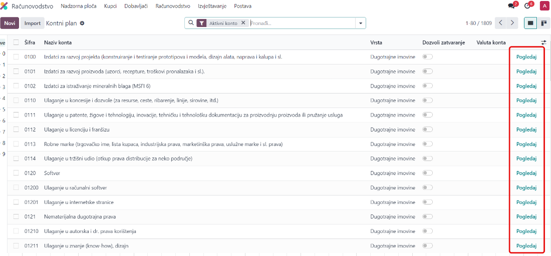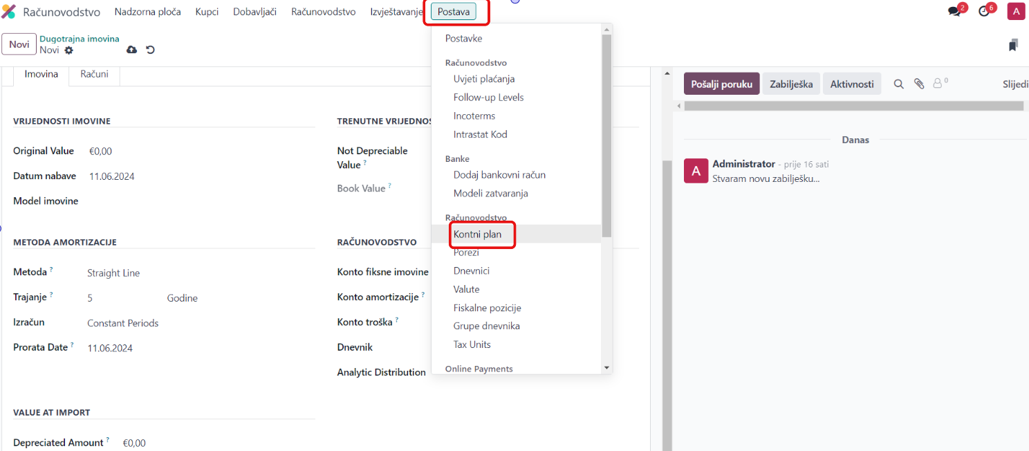Možete odabrati Kontni plan iz izbornika "postavke" kako biste automatizirali imovinu.