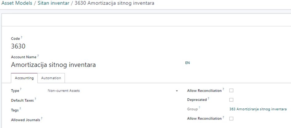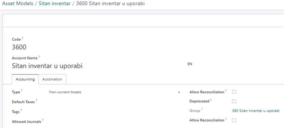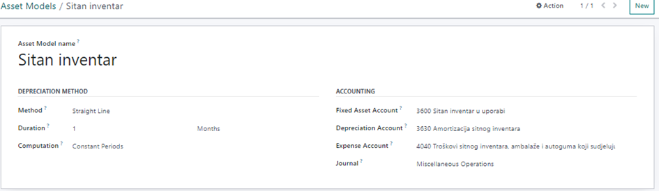 Unutar „Accounting“ modula na postavkama možemo definirati poseban modle koji ćemo koristiti za sitan inventar: