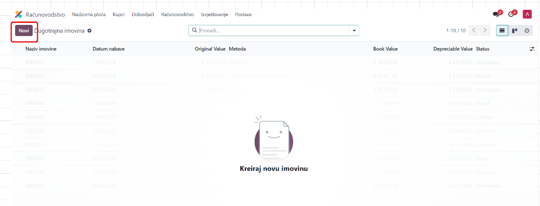 Klikom na novi kreiranmo novu dugotrajnu imovinu.