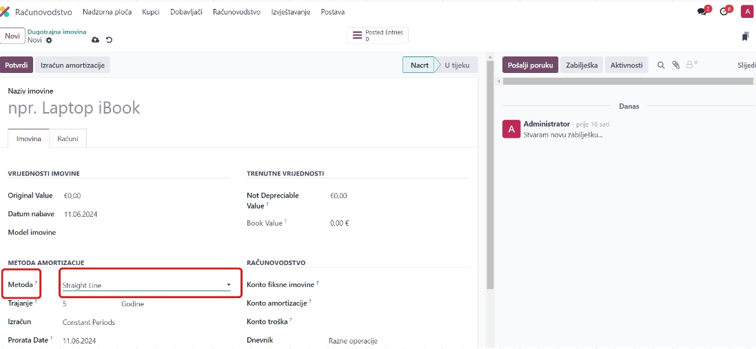 Opcija "kontni plan" omogućuje vam unos računa koji će se koristiti za smanjenje vrijednosti imovine tijekom unosa amortizacije.