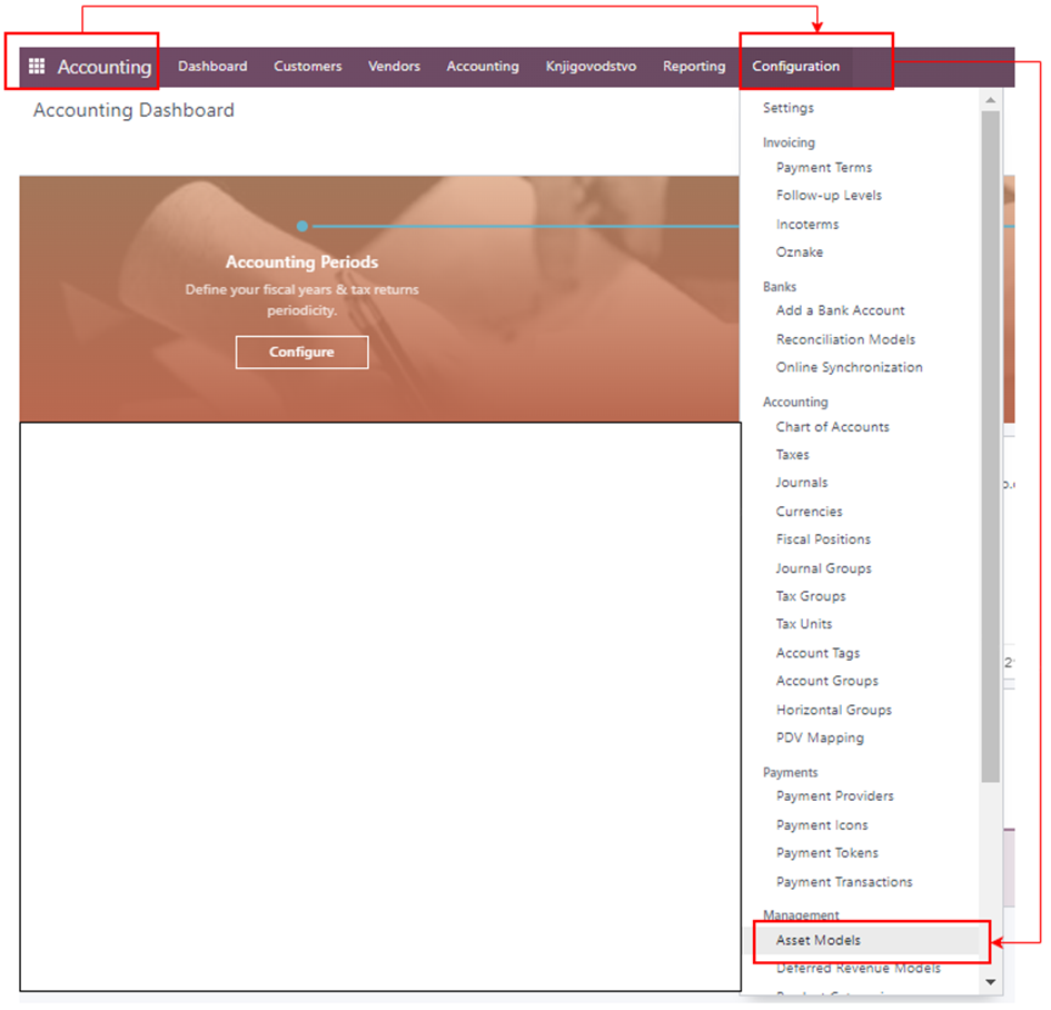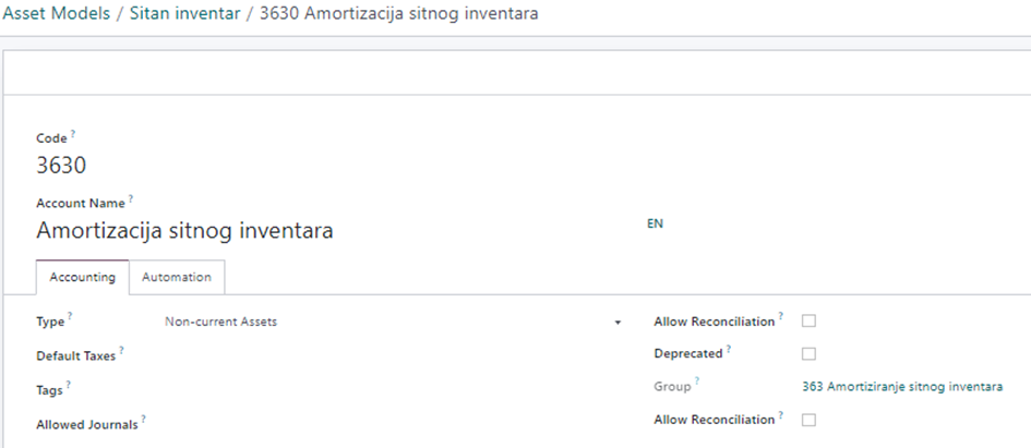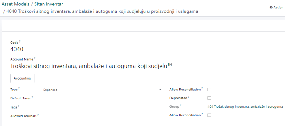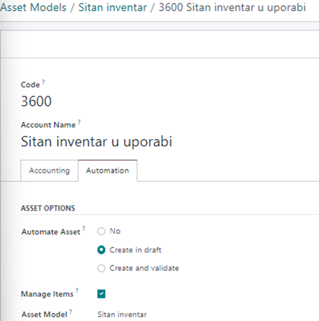 Unutar „Accounting“ modula na postavkama možemo definirati poseban modle koji ćemo koristiti za sitan inventar: